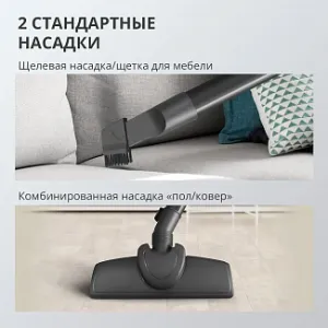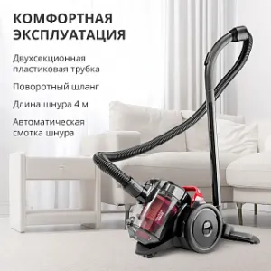 Пылесос комплектуется двухсекционной пластиковой трубкой, длиной шнура в 4 метра и функцией автосматывания, что значительно упрощает хранение устройства после уборки. В наборе вы найдете щелевую насадку и щетку для мебели, а также комбинированную насадку для полов и ковров, что делает его универсальным помощником для любой уборки.