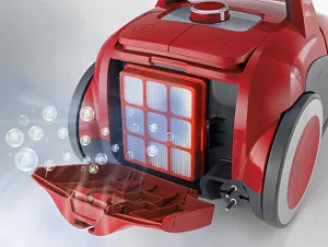 Выпускной фильтр НЕРА удаляет до 99% пыли из воздуха, а также задерживает пыльцу и продукты жизнедеятельности клещей, что очень важно для людей, страдающих астмой и аллергией. Для дополнительной эффективности на контейнере для пыли установлен второй фильтр HEPA.