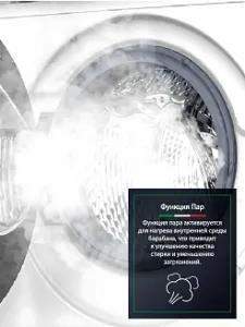 Активный пар - специальный паровой режим, позволяющий устранить впитавшийся запах и разгладить легкие складки без применения моющих средств. Под воздействием высокой температуры уничтожаются вирусы, бактерии и даже аллергены. Данный режим чаще всего используют для освежения вещей. Помещенная в барабан одежда при исключительно паровой обработке не намокает. Встроенный нагреватель превращает жидкость в пар, который и подается из отверстий в барабане стиральной машины.