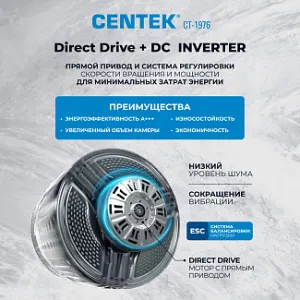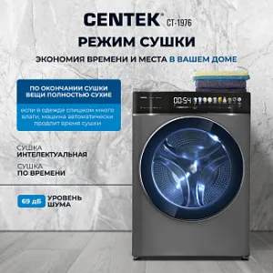 Представляем новинку CENTEK Inverter DIRECT DRIVE MOTOR CT-1976 в сером цвете. Основное преимущество данной модели в сочетании современных технологий и стиля, отсутствии лишних деталей. Машина оснащена цветным цифровым дисплеем и сенсорным управлением, что позволяет быстро определиться с выбором необходимой программы. Инверторный двигатель обеспечивает бесшумную работу, высокую энергоэффективность А+++. Увеличенный объем камеры который рассчитан на 10 кг стирки и 6 кг сушки, диаметр дверцы 520 мм, и функция подсветки барабана – для более комфортной загрузки и разгрузки белья. Антибактериальная манжета люка предотвращает появление плесени и неприятных запахов. Помимо основных функций, машина оснащена функцией SMART – стирка в одно касание. Инверторная стиральная машина с прямым приводом CENTEK CT-1976 – новый взгляд на привычный уход за вещами.