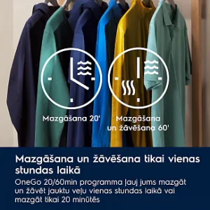 OneGo 20/60 мин. Программа позволяет постирать и высушить небольшое количество белья всего за час или постирать его всего за 20 минут. вовремя. Если вы спешите, воспользуйтесь быстрым и простым решением.
