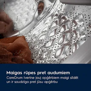 Барабан CareDrum обеспечивает плавное скольжение тканей благодаря специальному покрытию и функции подъема. Специальная конструкция резервуара обеспечивает бережное обращение с одеждой.