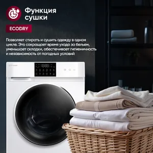 Стиральная машина с функцией сушки белья позволит вам экономить своё время и не ждать пока белье высохнет. Рекордная загрузка белья для сушки до 7 килограмм возможна благодаря новым технологиям и увеличенной конструкции барабана. После выбора режима сушки машинка покажет пользователю, сколько осталось времени до окончания программы. Теперь можно получить не только хорошо постиранное, но и уже просушенное белье.