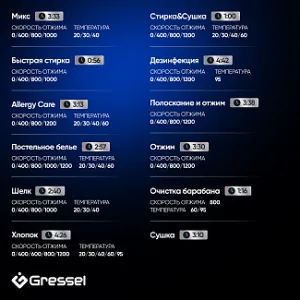 12 программ: Микс, быстрая стирка, Шелк, Хлопок, Сушка, Постельное белье, Стирка/Сушка, Allergy Care, Дезинфекция, Полоскание и отжим, Отжим, Очистка барабана