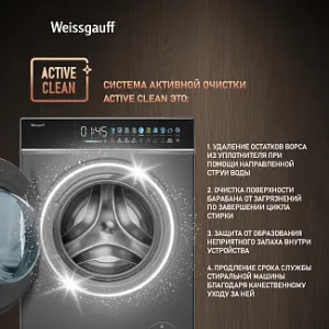 - Система активной очистки ACTIVE CLEAN - при помощи направленной струи воды удаляет остатки ворса из уплотнителя, а также с поверхности барабана, не оставляя загрязнениям ни единого шанса и продлевая срок службы вашей стиральной машины Weissgauff на долгие годы!