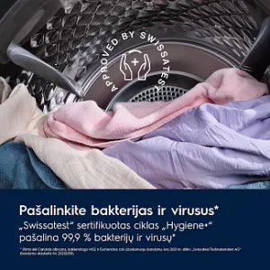 Выбрав режим сушки «Гигиена», вы сушите белье при температуре выше 60°C и убиваете 99,9% бактерий и вирусов.