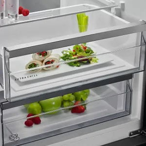 Защитите качество, вкус и свежесть нарезанного мяса и сыров с помощью выдвижного ящика Extra Chill. Температура в выдвижном ящике поддерживается ниже, чем в остальной части прибора, благодаря активной циркуляции холодного воздуха.