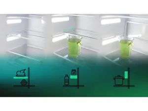 Полки в холодильной камере изготовлены из закаленного стекла и выдерживают нагрузку до 40 кг.