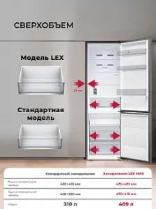 LED-лампы обеспечивают яркий свет, помогая вам быстро найти все, что нужно. Электронная панель управления делает настройку параметров интуитивно понятной. А перенавешиваемые двери делают холодильник LEX LKB185 универсальным для любой кухни.