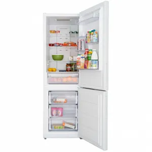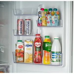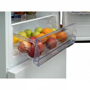 Функциональность: холодильная камера наполнена четырьмя прочными полками из закаленного стекла и пластиковым ящиком для овощей и фруктов, также на дверце находятся две длинные и три небольшие полки. В морозильной камере расположены три прозрачных пластиковых ящика