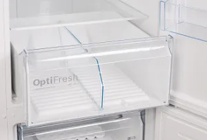 Три закаленных стеклянных полки, регулируемых по высоте, и три полки на двери обеспечивают гибкую организацию внутреннего пространства. Влажная зона сохранения свежести с регулировкой уровня влажности предназначена для оптимального хранения фруктов и овощей. Морозильное отделение обладает мощностью замораживания до 15 килограммов продуктов в сутки. Три выдвижных пластиковых ящика предоставляют удобный доступ к содержимому и эффективное разделение продуктовых групп. Функция суперзамораживания позволяет быстро снижать температуру для сохранения питательных свойств свежих продуктов.