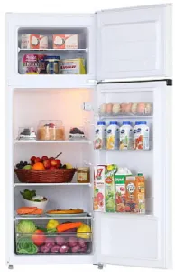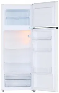 Двухкамерный полноразмерный холодильник DEXP RF-TD210NMA/W сохранит все свойства, помещенных в него продуктов питания. Основных отдела – 2. Морозильная камера с минимальной температурой -24 градуса и мощностью заморозки 2 килограмма в сутки расположена в верхней части. Ее пространство разделено металлической решетчатой полкой. Она рассчитана на 41 литр. Холодильный отсек с объемом 166 литров имеет капельную систему оттаивания. Пока работает компрессор, градус в устройстве постепенно снижается за счет забора тепла испарителем. При образовании наледи в морозильном отделе, размораживание необходимо проводить вручную.