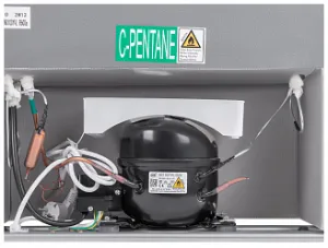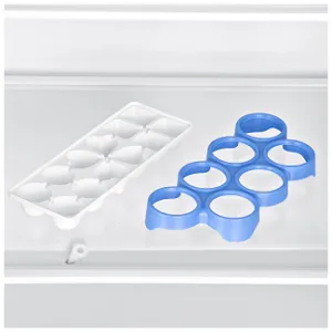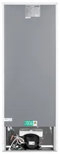 Согласно классической схеме, морозильная камера располагается в верхней части прибора. Оба отсека устройства работают от одного компрессора и создают минимальное количество шума – всего около 39 дБ. Такая громкость возможна из-за применения современного хладагента R600a. Он отличается от аналогов тем, что не создаёт излишнего давления, а значит, и звуков. Энергии данной модели требуется немного – около 211 кВт*ч/год. Этот показатель характеризуется классом А+ по экономности использования энергии. Если подача питания прекращается, устройство поддерживает внутри приемлемую для хранения пищи температуру в течение 8,5 часов.