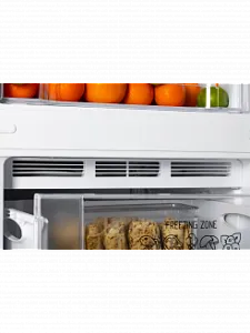 Верхнее расположение холодильной камеры позволяет хранить готовые блюда, напитки, молочную продукцию, овощи и фрукты на уровне глаз, что удобно для ежедневного приготовления. Отделение поддерживает температуру 0…+8°C и оборудовано автоматической капельной системой оттаивания, что избавляет от необходимости регулярной разморозки.
