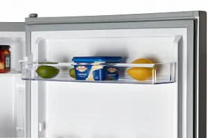 Внутренняя посуда холодильника имеет красивый серебристый отлив и инфографику на ящиках и дверных полках.
