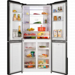 4-х дверный холодильник имеет единое пространство верхних полок холодильной камеры, чтобы удобно было размещать габаритные кастрюли и контейнеры. Прочные полки из закаленного стекла можно регулировать по высоте, а ящики в холодильной камере предназначены для хранения овощей и фруктов и оснащены влажной зоной свежести и сухой.