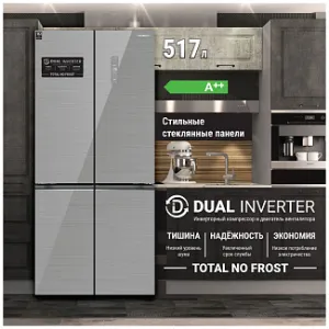 Холодильник WILLMARK MDC-697IDG незаменимый помощник на кухне с электронным управлением представлен в цвете SkyGrey и является мощным холодильным агрегатом с общей вместимостью 517 литров. Технология DUAL INVERTER означает наличие в устройстве двух инверторных элементов: компрессора и вентилятора. Для хранения в нем продуктов предусмотрены 3 камеры с распашными дверями со стеклянными панелями. Модель совмещает в себе стильный дизайн, отличные технические характеристики и высокие эксплуатационные качества. В холодильном отделении пространство разделено четырьмя большими полками и двумя ящиками для хранения овощей, зелени и фруктов. На дверцах холодильного отделения также можно хранить продукты: на каждой из них предусмотрено по две полки. В морозильной камере – четыре прозрачных ящика и две полки. Увеличенный гарантийный срок на инверторный компрессор составляет 10 лет, а общий гарантийный срок составляет 3 года со дня покупки!