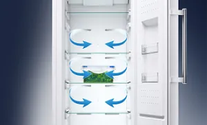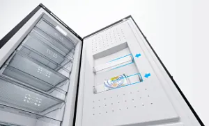 Охлажденный воздух внутри морозильника распределяется равномерно и быстро, и все свежие продукты замораживаются более интенсивно и эффективно, а значит, сохраняют свои питательные свойства и витамины надолго