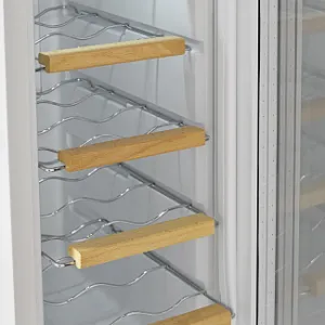 - Внутренняя температура регулируется с помощью сенсорного управления в диапазоне от 10 до 18 °C, что позволяет использовать шкаф для хранения различных сортов вин. LED-дисплей с белой индикацией отображает температуру внутри, а изменить её можно с помощью сенсорных кнопок, расположенных рядом. Панель управления автоматически блокируется после последнего взаимодействия.
