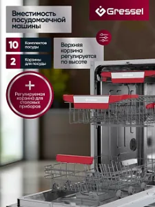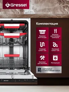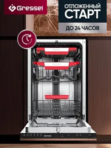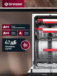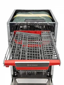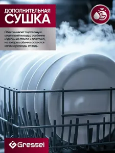 Посудомоечная машина Gressel оснащена дополнительным, третьим, лотком для столовых приборов. Это значит, что корзина, которая в обычных моделях служит для размещения ложек и вилок, не занимает места в посудомойке. В специальном лотке приборы лучше отмываются, их удобнее раскладывать и вынимать.