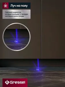 Удобное и интуитивно понятное решение для контроля за процессом мойки посуды. Во время работы устройства на пол проецируется световой луч, который указывает, что посудомоечная машина всё ещё в процессе, а цифровая индикация на экране показывает оставшееся время до завершения цикла. Это позволяет быстро и точно понять, на каком этапе находится мойка, не открывая дверь машины и не прерывая процесс работы. Функция способствует повышению удобства использования и помогает легко планировать время.