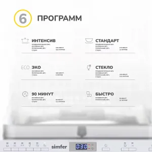 Шесть наиболее необходимых и востребованных программ мойки, которые помогут справиться с любыми видами загрязнений посуды, включая трудносмываемые загрязнения кастрюль и предметов из стекла.