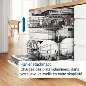 Система регулировки по высоте Rackmatic поможет оптимизировать пространство посудомоечной машины под ваши индивидуальные потребности. Даже полностью загруженный верхний короб можно с легкостью переставлять по высоте на 3-х уровнях шагом до 5 см, нажав на рычажки, расположенные по бокам короба.