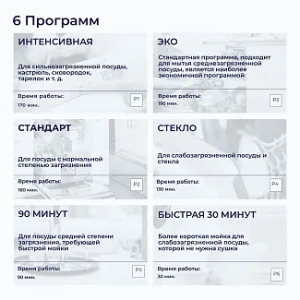 Шесть наиболее необходимых и востребованных программ мойки, которые помогут справиться с любыми видами загрязнений посуды, включая трудносмываемые загрязнения кастрюль и предметов из стекла.