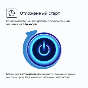 Процесс мойки посуды можно отложить на заданное время, например, не дожидаясь момента действия экономичного тарифа электроэнергии, установить таймер на включение прибора в ночное время.