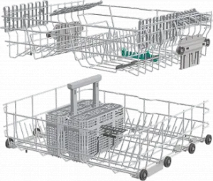 Корзины имеют цветные складные держатели и регулируемую компоновку, чтобы было удобно загружать посуду. Верхняя корзина легко переставляется по высоте между двумя уровнями, и это позволяет поместить в машину даже самые большие кастрюли и тарелки. Держатели для тарелок в нижней корзине складываются, обеспечивая больше места для большой посуды. Для столовых приборов предназначен специальный лоток, где предметы располагаются отдельно, поэтому не царапают другую посуду и полностью высыхают. Разработчики уделили внимание каждой детали, чтобы максимально облегчить мытье посуды.