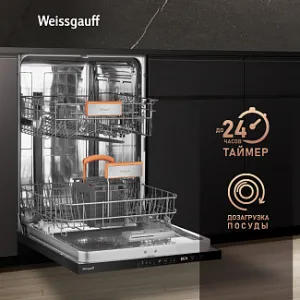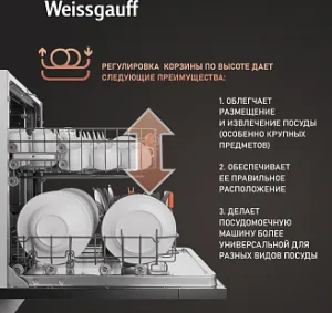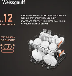 - До 12 комплектов посуды одновременно вы можете расположить в данной посудомоечной машине, благодаря современным продуманным и эргономичным корзинам, которыми Weissgauff оснастили эту модель!