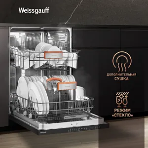 - До 12 комплектов посуды одновременно вы можете расположить в данной посудомоечной машине, благодаря современным продуманным и эргономичным корзинам, которыми Weissgauff оснастили эту модель!