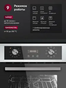 Режимы работы: Конвекция, Нижний нагрев, Верхний + нижний нагрев, Верхний + нижний нагрев + конвекция, Нижний нагрев + Турбо (Пицца), Турбо гриль, Турбо гриль + конвекция