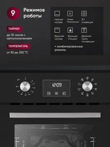 9 режимов работы: Таймер до 10 часов с автоотключением и температурный диапазон от 50° до 250°C предлагают гибкость и точность в приготовлении различных блюд.