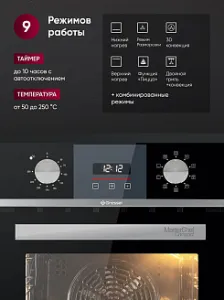 Девять режимов работы, включающие работу классических нагревательных элементов, кольцевого нагревателя в сочетании с конвектором, позволяют готовить самые сложные и необычные блюда.