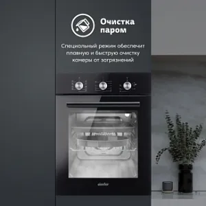 Данный метод очистки позволяет удалять жировые отложения, не используя при этом сильные химические вещества, которые могут повредить внутреннюю поверхность духовки. Устанавливаете режим, наливаете воду, которая медленно испаряясь, смягчает загрязнение и после протираете мягкой тряпкой.