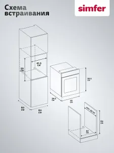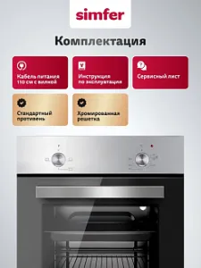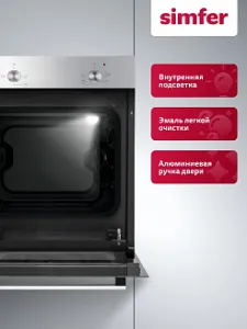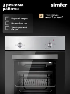 Духовой шкаф электрический встраиваемый Simfer B4EM04070 - современная техника для кухни, которая благодаря многообразию режимов, позволяет готовить не только повседневную пищу, но и изысканные блюда. С помощью удобных поворотных ручек легко выбрать необходимый режим приготовления для любого рецепта. Встроенная подсветка позволит наблюдать за процессом, не открывая при этом дверцу шкафа, а значит сохраняя тепло внутри.Таймер подскажет, когда блюдо будет готово, а двойное стекло защитит от ожога при случайном прикосновении к дверце шкафа. При первом запуске рекомендуем протопить печь 15 минут при 200°C с противнем, наполненным водой (300-400 г.), для прогорания заводской смазки.
