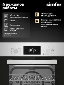 Режимы работы: Верхний + нижний нагрев, Верхний + нижний нагрев + конвекция, Верхний нагрев, Гриль, Гриль + конвекция, Конвекция