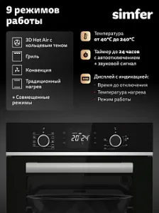 Режимы работы: Верхний + нижний нагрев, Верхний + нижний нагрев + конвекция, Верхний нагрев, Гриль, Гриль + конвекция, Конвекция, Нижний нагрев, Турбо режим