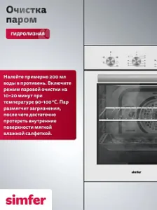Данный метод очистки позволяет удалять жировые отложения, не используя при этом сильные химические вещества, которые могут повредить внутреннюю поверхность духовки. Устанавливаете режим, наливаете воду, которая медленно испаряясь, смягчает загрязнение и после протираете мягкой тряпкой.