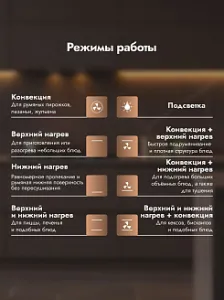 Режимы работы: Верхний + нижний нагрев, Верхний + нижний нагрев + конвекция, Верхний нагрев, Верхний нагрев + конвекция, Конвекция, Нижний нагрев, Нижний нагрев + конвекция