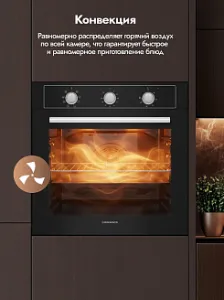 Конвекционный вентилятор обеспечивает постоянную циркуляцию горячего воздуха по всей камере, что позволяет равномерно запекать блюдо со всех сторон, а также экономить время на приготовление. Режим конвекции особенно оценят любители приготовления выпечки.