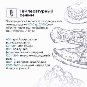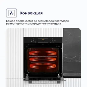 Конвекционный вентилятор обеспечивает постоянную циркуляцию горячего воздуха по всей камере, что позволяет равномерно запекать блюдо со всех сторон, а также экономить время на приготовление. Режим конвекции особенно оценят любители приготовления выпечки.