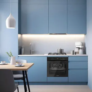 Сочетание стекла, стали и прямых, горизонтальных линий, используемых в духовых шкафах современного дизайна объединяет внешний вид кухонной мебели и бытовой техники, создавая полноценное решение в стиле хай-тек.