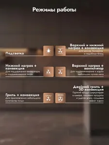 Шесть режимов работы, включающие работу классических нагревательных элементов, кольцевого нагревателя в сочетании с конвектором, позволяют готовить самые сложные и необычные блюда.