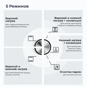 Пять режимов работы, включающие работу классических нагревательных элементов, кольцевого нагревателя в сочетании с конвектором, позволяют готовить самые сложные и необычные блюда.