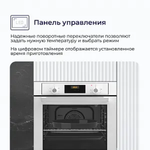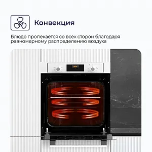Конвекционный вентилятор обеспечивает постоянную циркуляцию горячего воздуха по всей камере, что позволяет равномерно запекать блюдо со всех сторон, а также экономить время на приготовление. Режим конвекции особенно оценят любители приготовления выпечки.