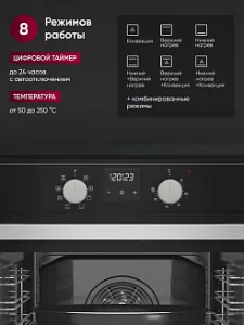 Восемь режимов работы, включающие работу классических нагревательных элементов, кольцевого нагревателя в сочетании с конвектором, позволяют готовить самые сложные и необычные блюда.