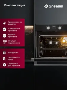 Хромированная решетка, стандартный противень, круглый противень, шнур для подключения, инструкция по эксплуатации, гарантийный талон, сертификат дополнительной гарантии.