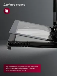 Особенности духовки, плиты: Вентилятор охлаждения, Дисплей, Полностью стеклянная внутренняя дверца, Хромированные направляющие